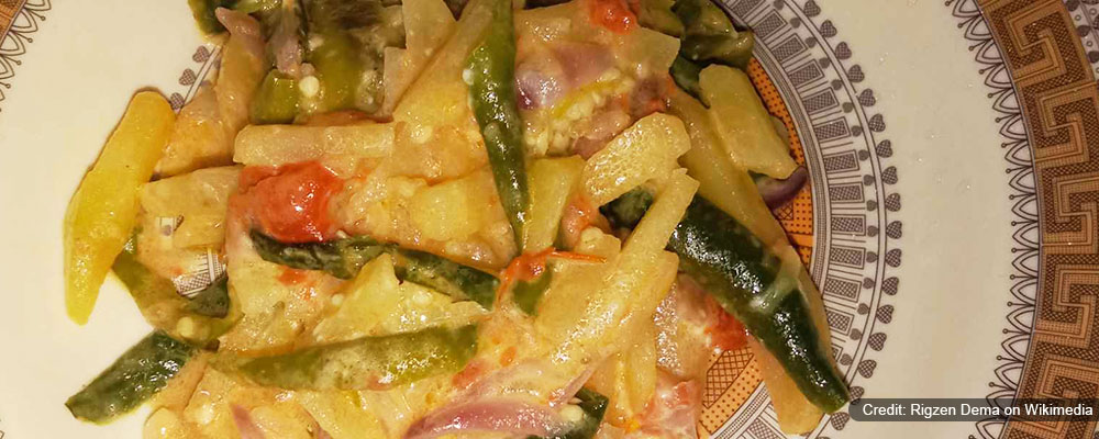 This is a spicy stew made with stir-fried pork meat combined with dried chillies, ginger, garlic and other spices. This is mostly served with rice and is the most popular dish in Bhutanese cuisine.